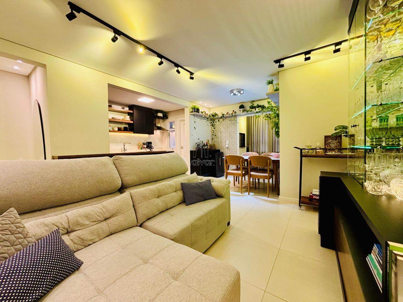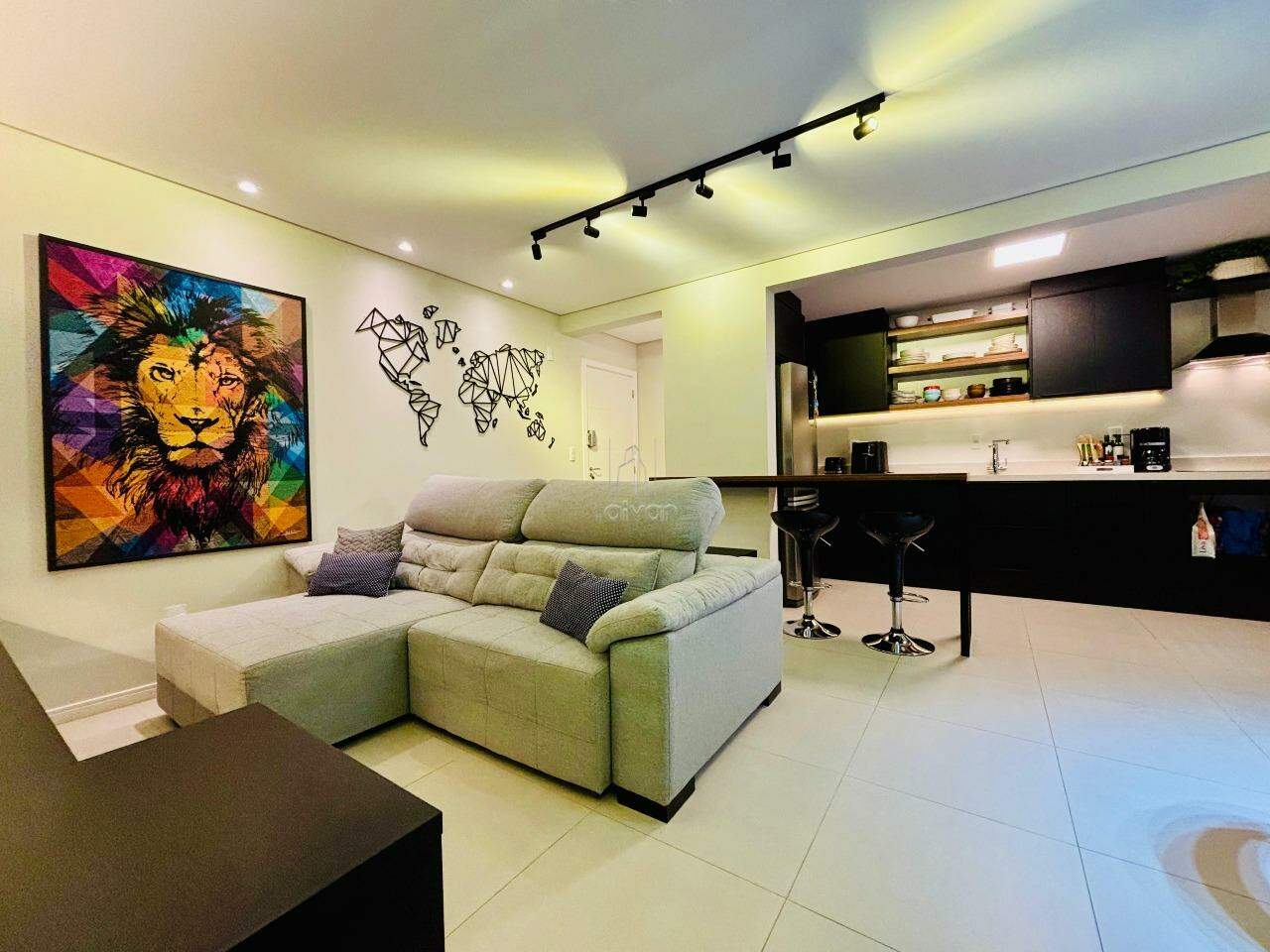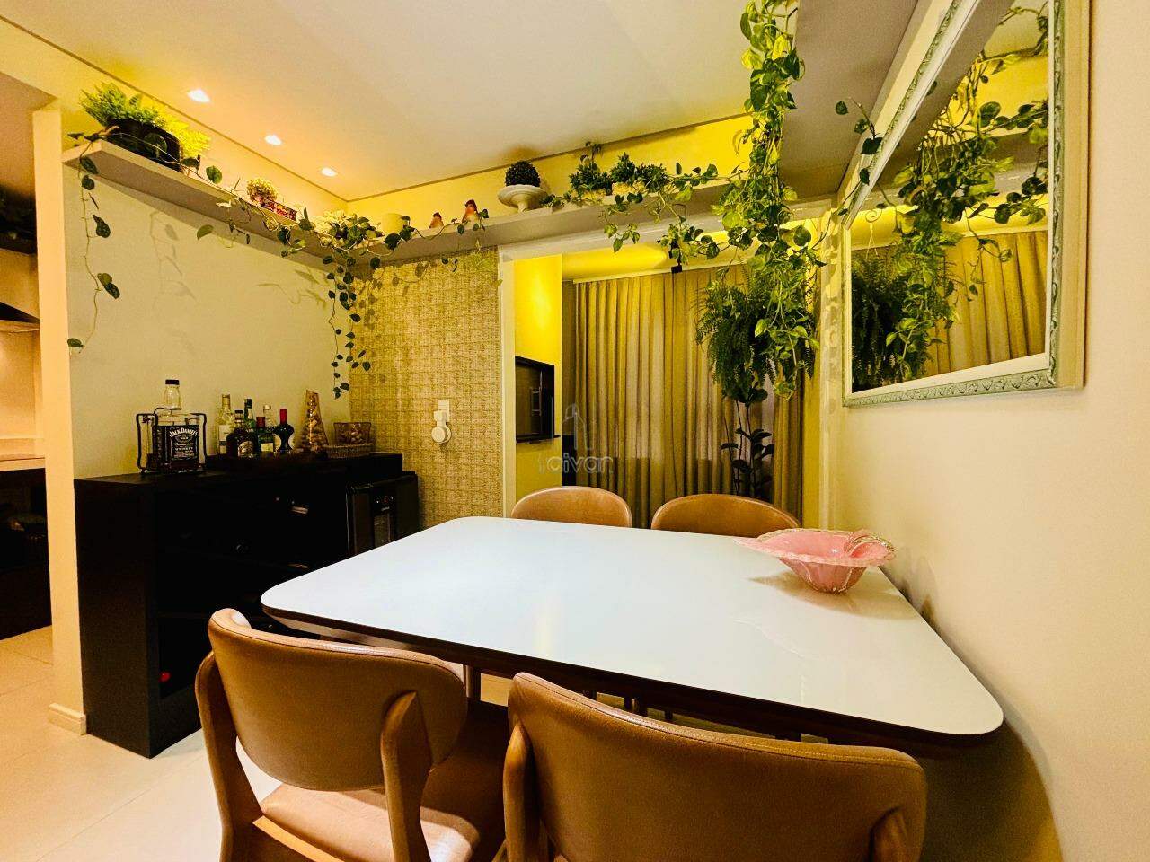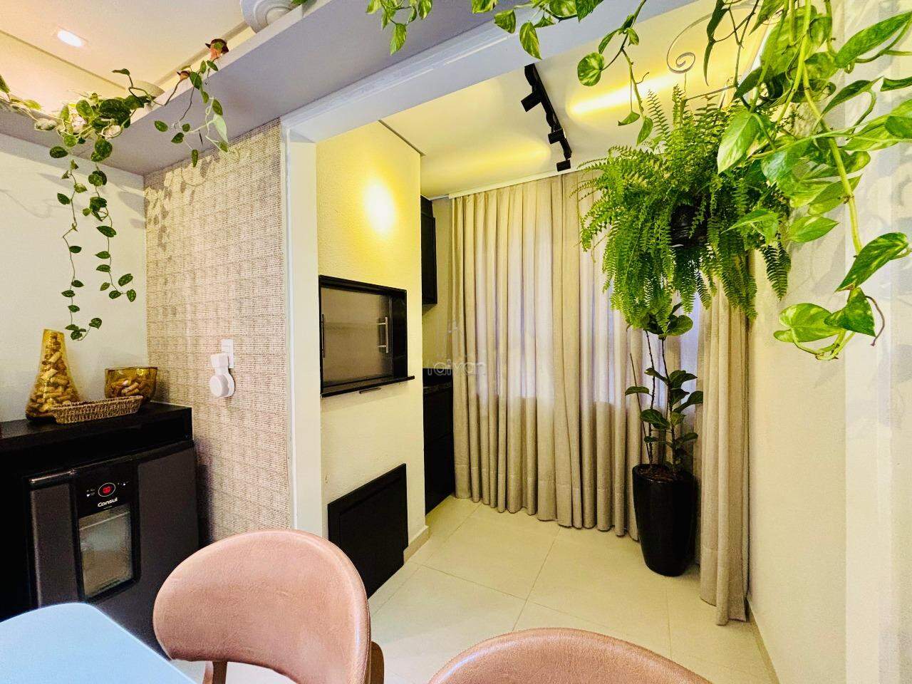 Imóvel com sala de estar, jantar, cozinha e sacada com churrasqueira integradas, 1 suíte + 1 quarto, banheiro social, área de serviço e 1 vaga.