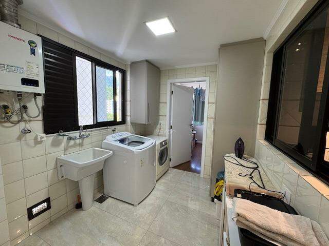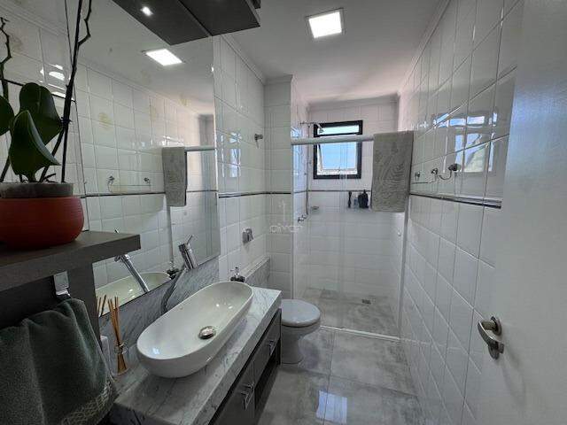 Conta com sala de estar, jantar, sacada com churrasqueira integradas, cozinha, 1 suíte + 2 quartos, 1 banheiro social, depósito, área de serviço, 1 banheiro de serviço e 2 vagas.