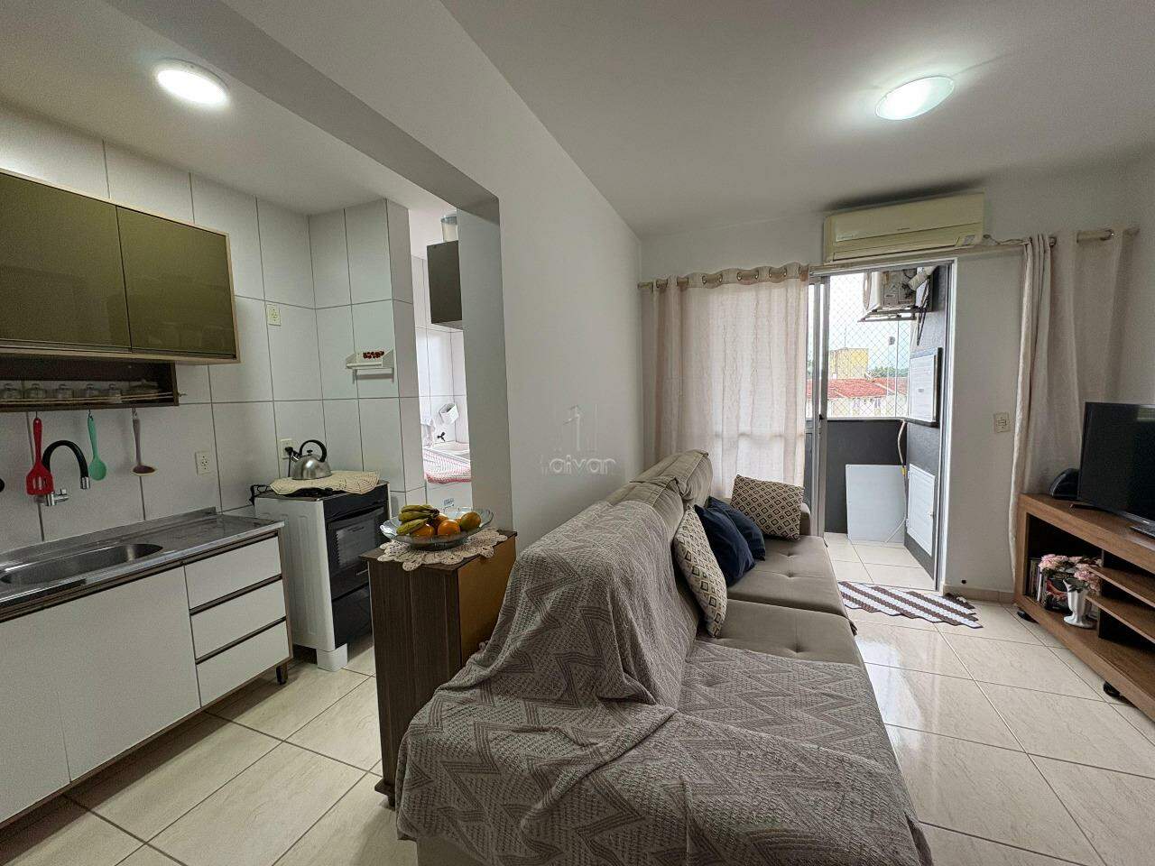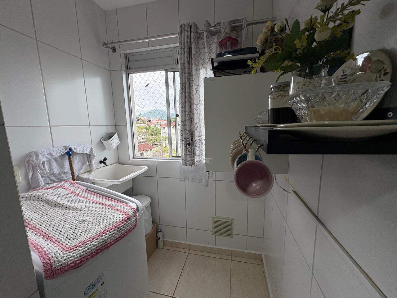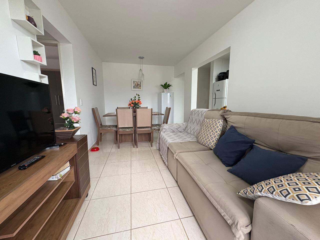 Imóvel conta com sala de TV e jantar integradas, cozinha, 2 quartos, 1 banheiro, área de serviço, sacada com churrasqueira e 1 vaga.