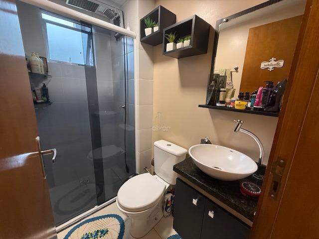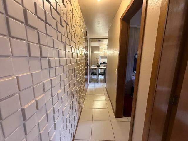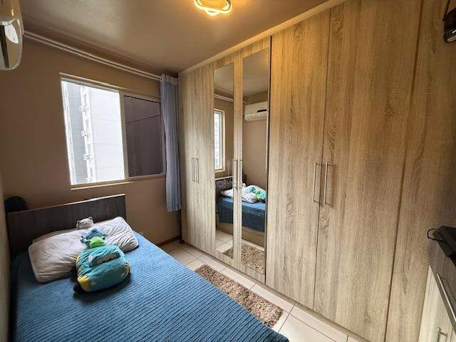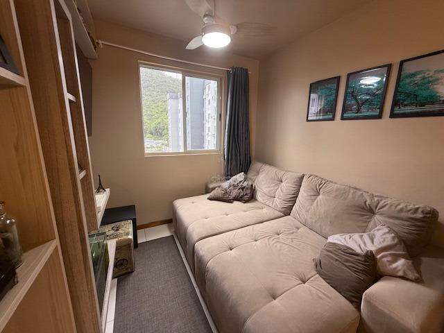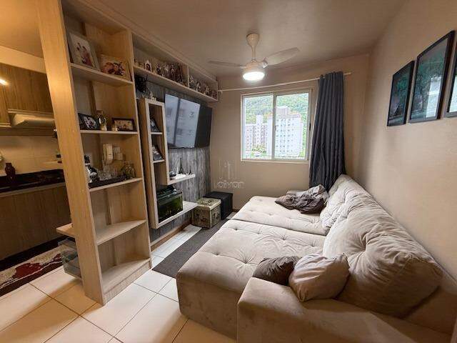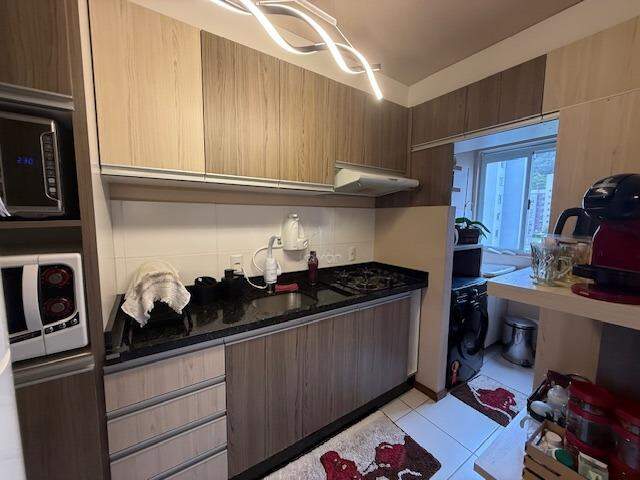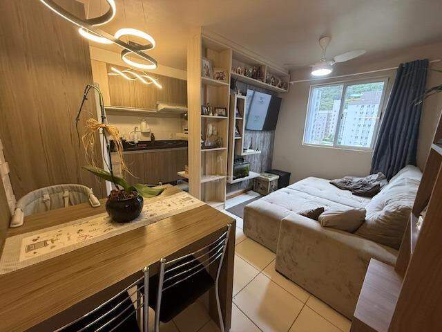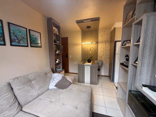 Imóvel conta com sala de estar e copa/cozinha integradas, 2 quartos, 1 banheiro, área de serviço e 1 vaga.