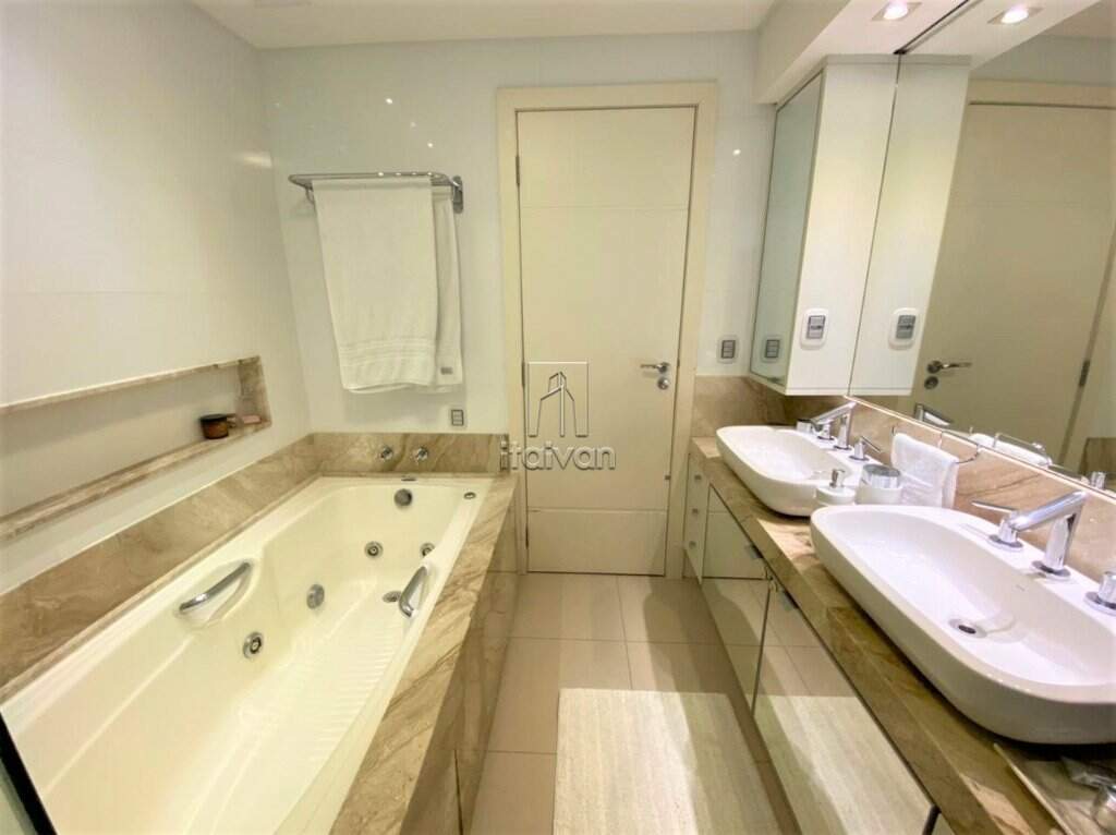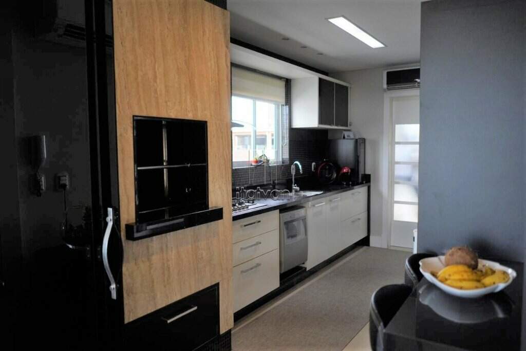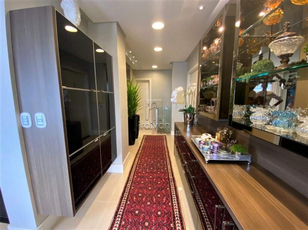 Demais características: Manta asfáltica na área superior externa; escadaria, banheiros, acabamentos entrada e churrasqueira de mármore travertino romano; interruptores marca italiana Bitcino; madeira maciça nos dormitórios; quarto de malas; persianas sacadas elétricas; móveis Florense; ficam todos os móveis soltos (não planejados) e eletrodomésticos; ar-condicionado em todos os ambientes (inclusive cozinha).