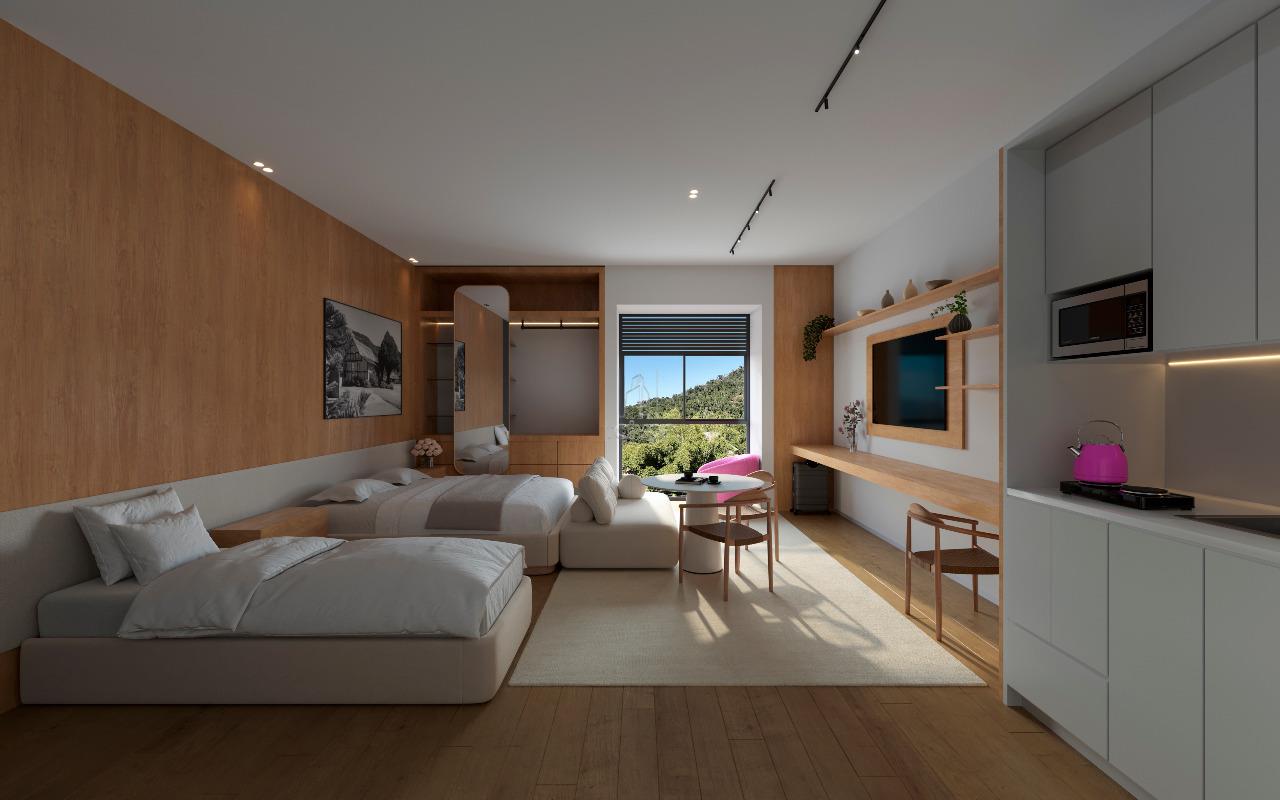 - Lofts: 26,06 a 33,51m² – suíte completa com copa