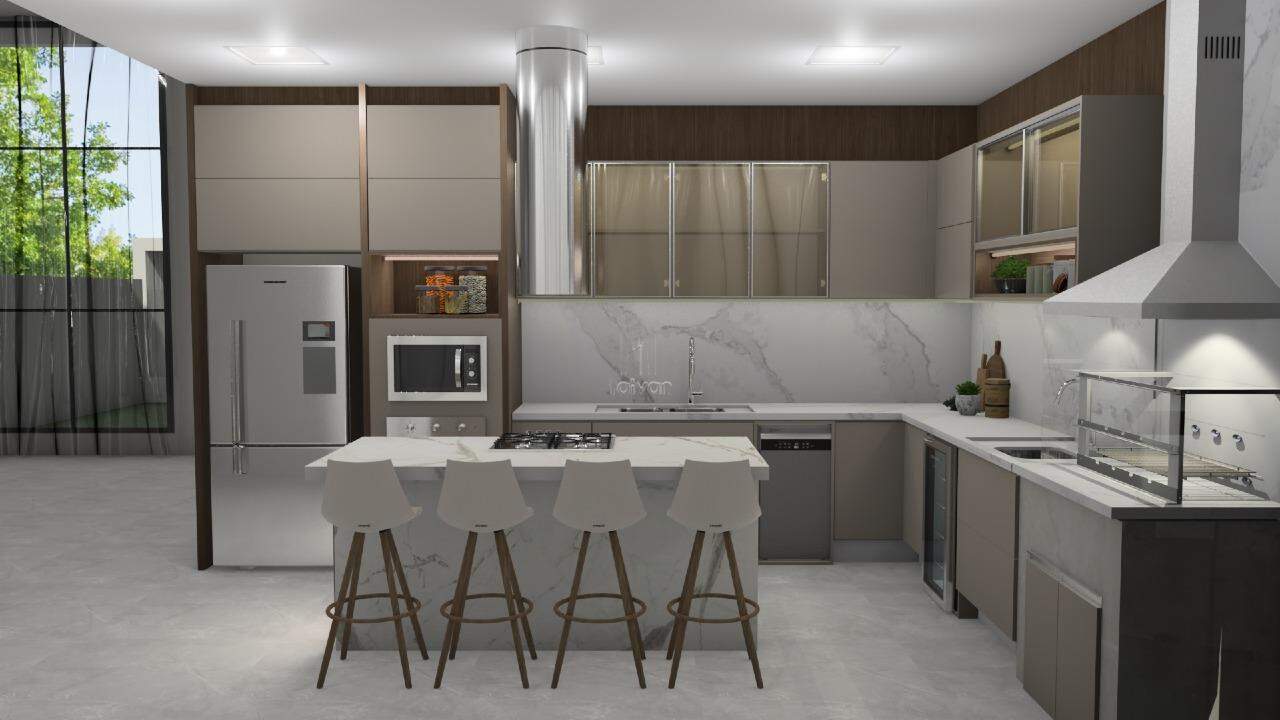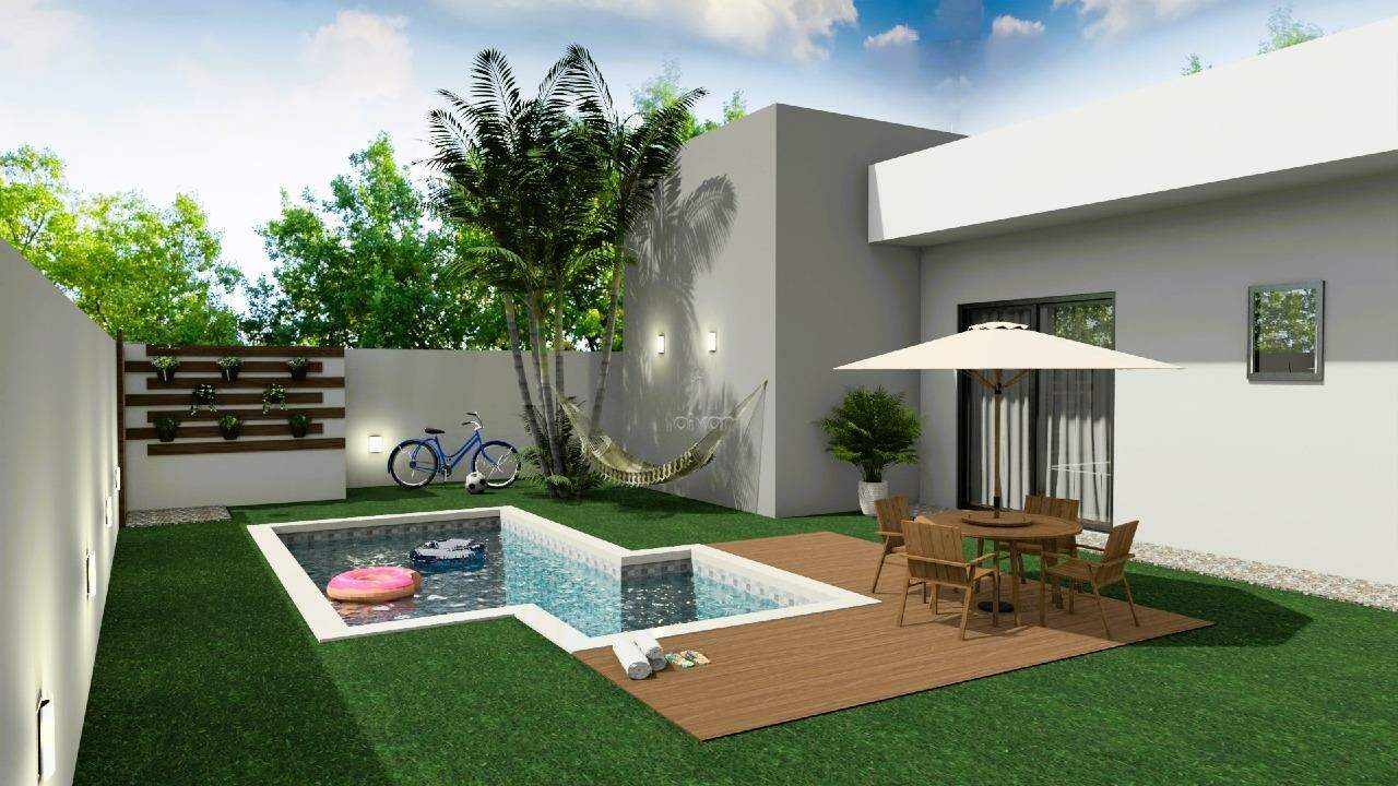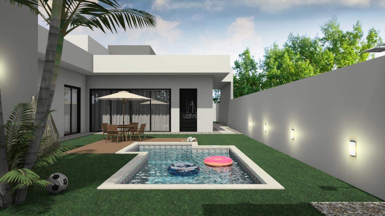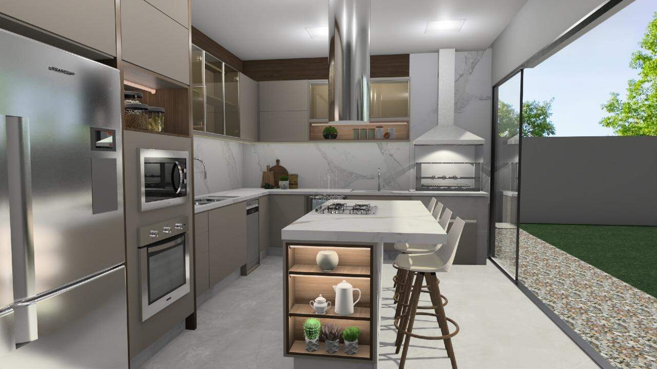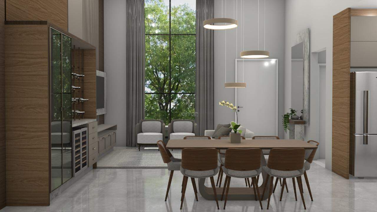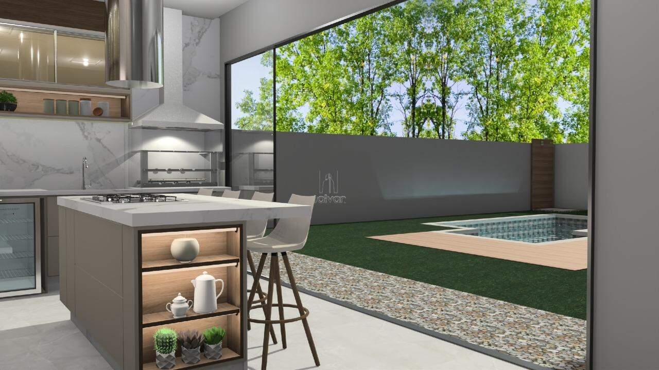 O projeto inclui sala de estar, jantar e cozinha gourmet integradas, 01 suíte com closet, 02 quartos, escritório, lavabo, banheiro social, área de serviço, além de área externa com piscina e 02 vagas.