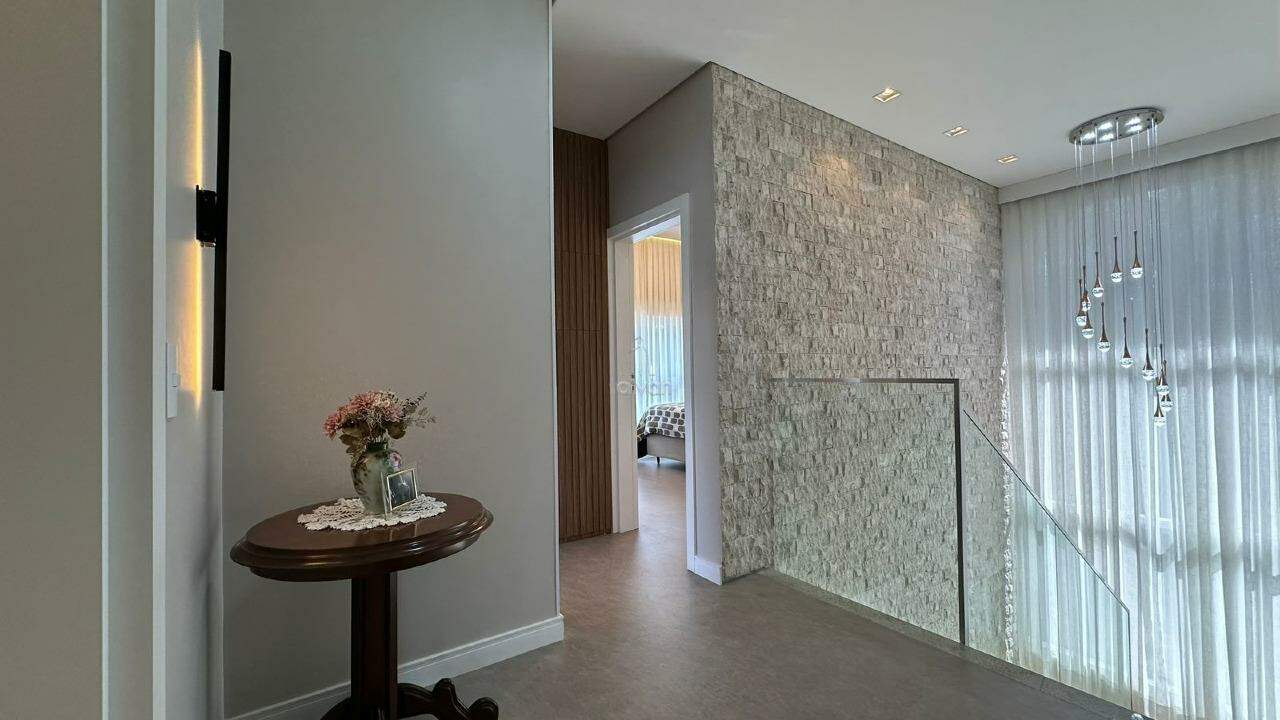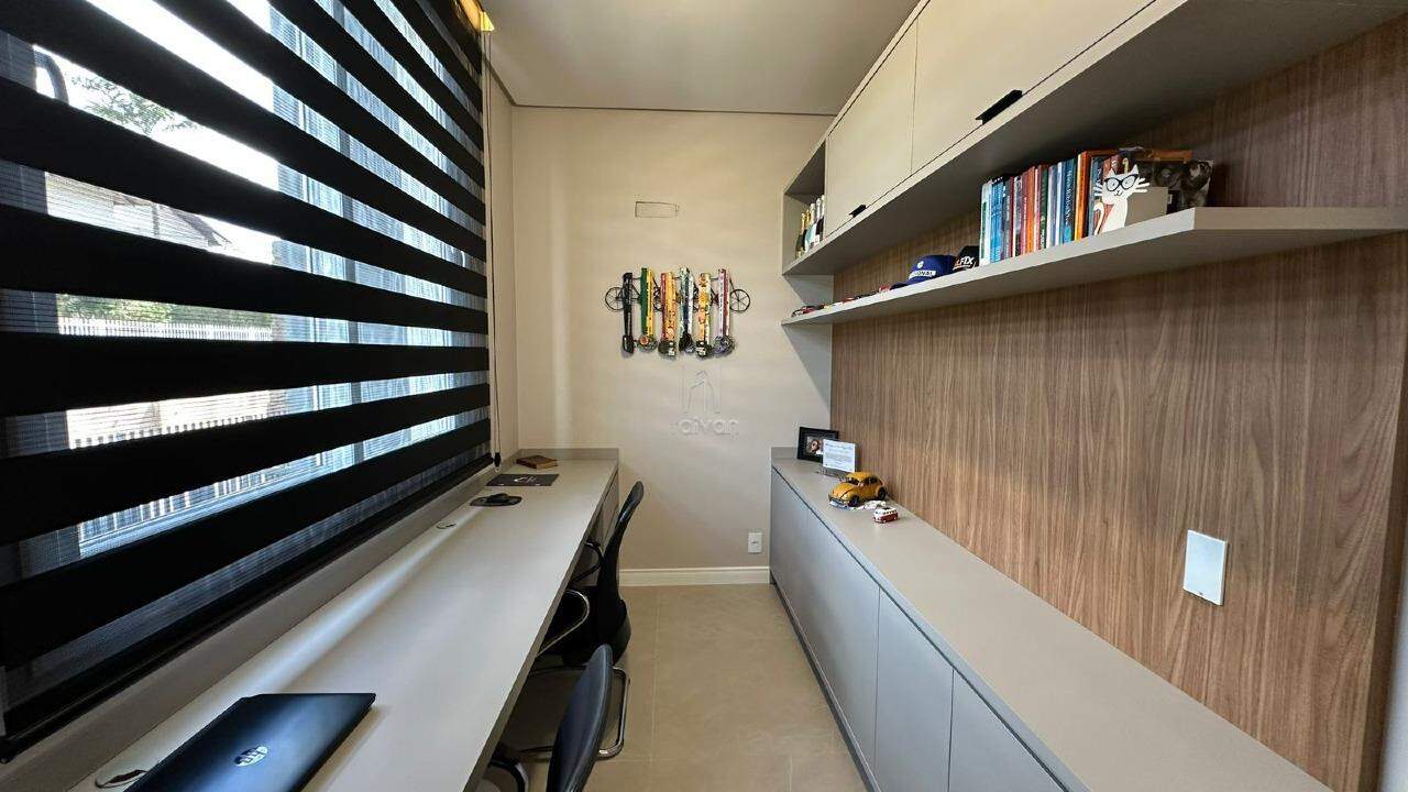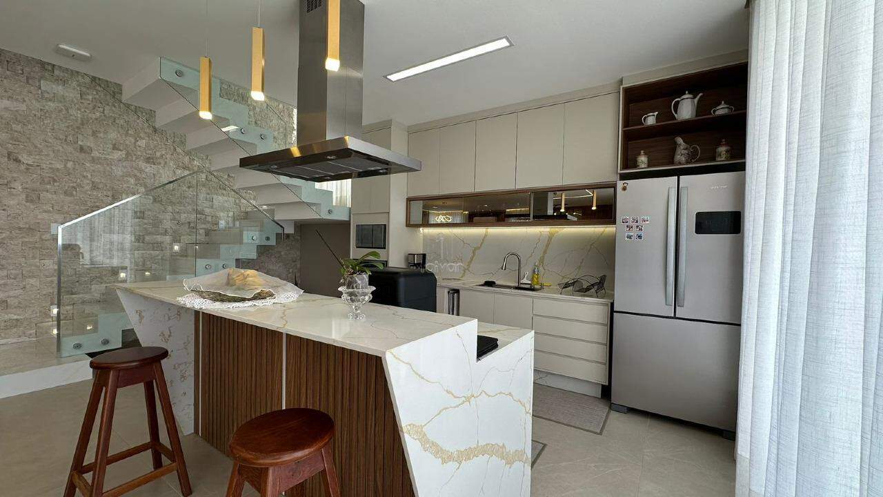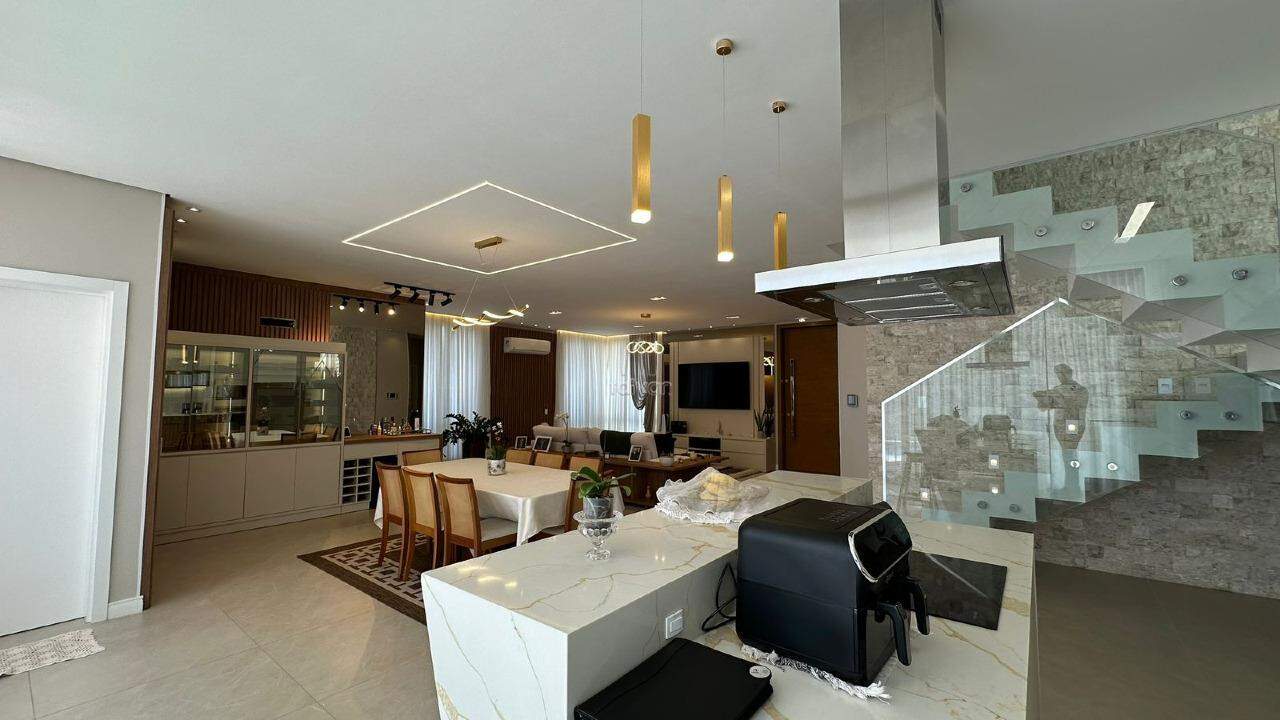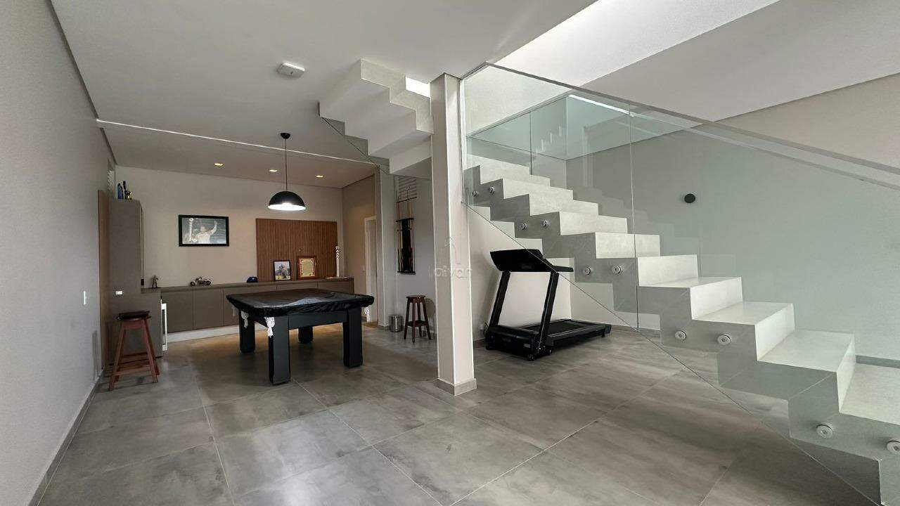 Conta com sala de estar, jantar e cozinha integradas, 1 suíte, 2 quartos, 1 banheiro social, 1 lavabo, escritório, área de serviço, despensa, sala de jogos e área de festas com churrasqueira, piscina, quintal e 3 vagas.