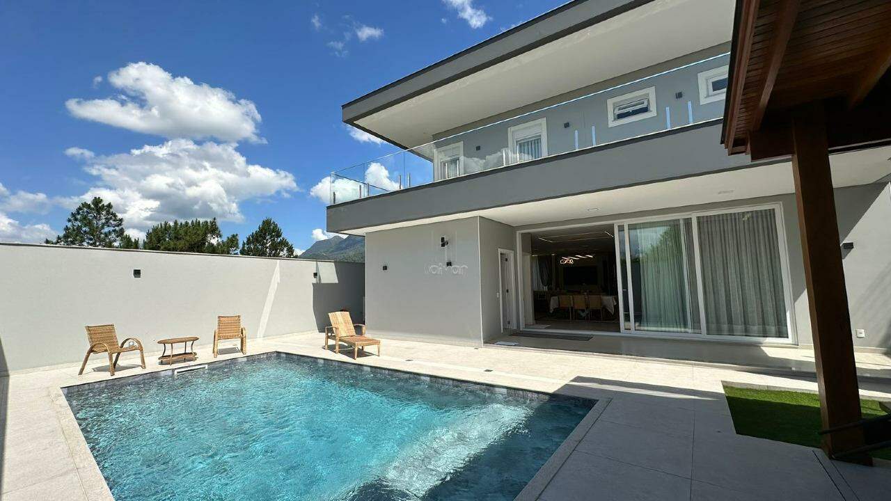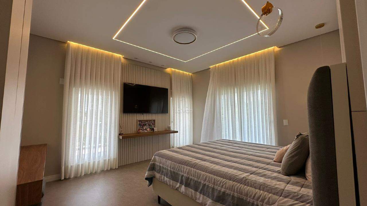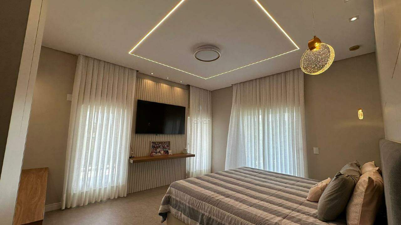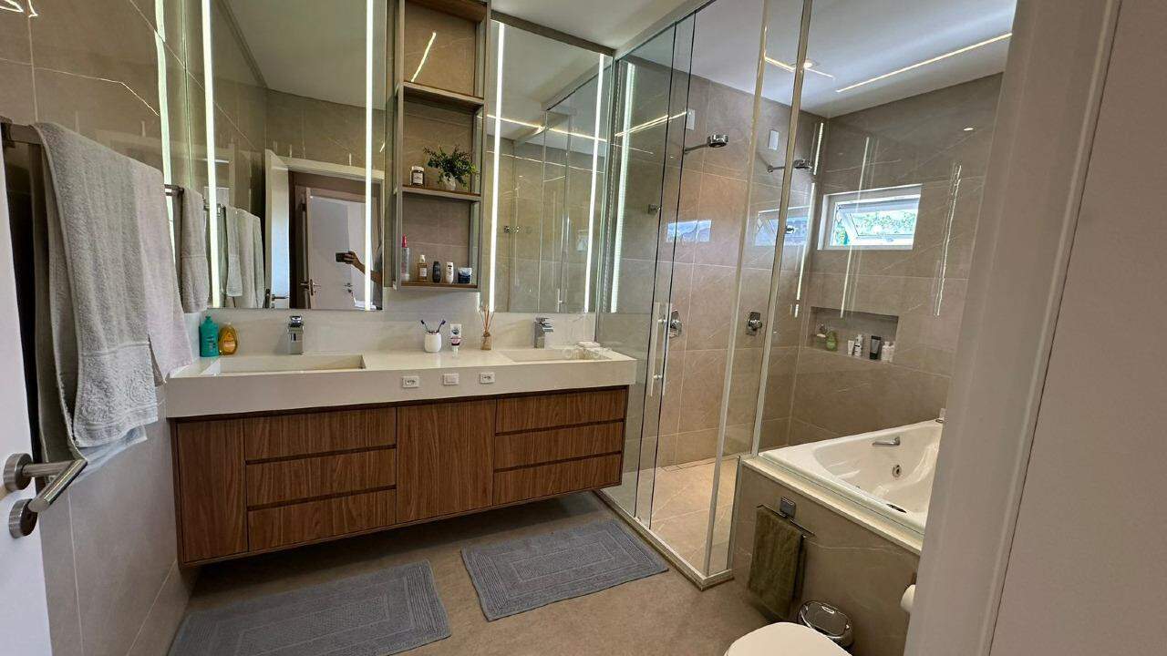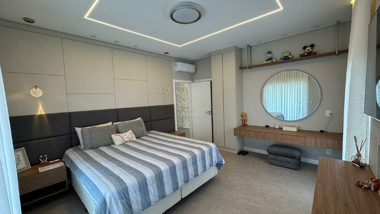 Conta com sala de estar, jantar e cozinha integradas, 1 suíte, 2 quartos, 1 banheiro social, 1 lavabo, escritório, área de serviço, despensa, sala de jogos e área de festas com churrasqueira, piscina, quintal e 3 vagas.