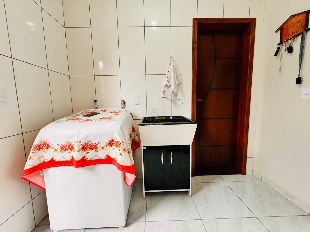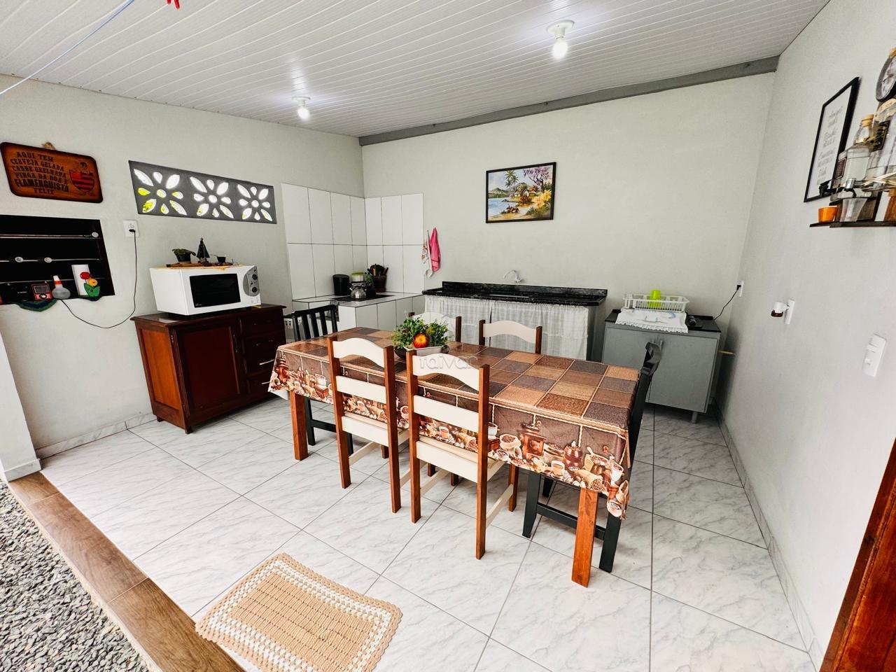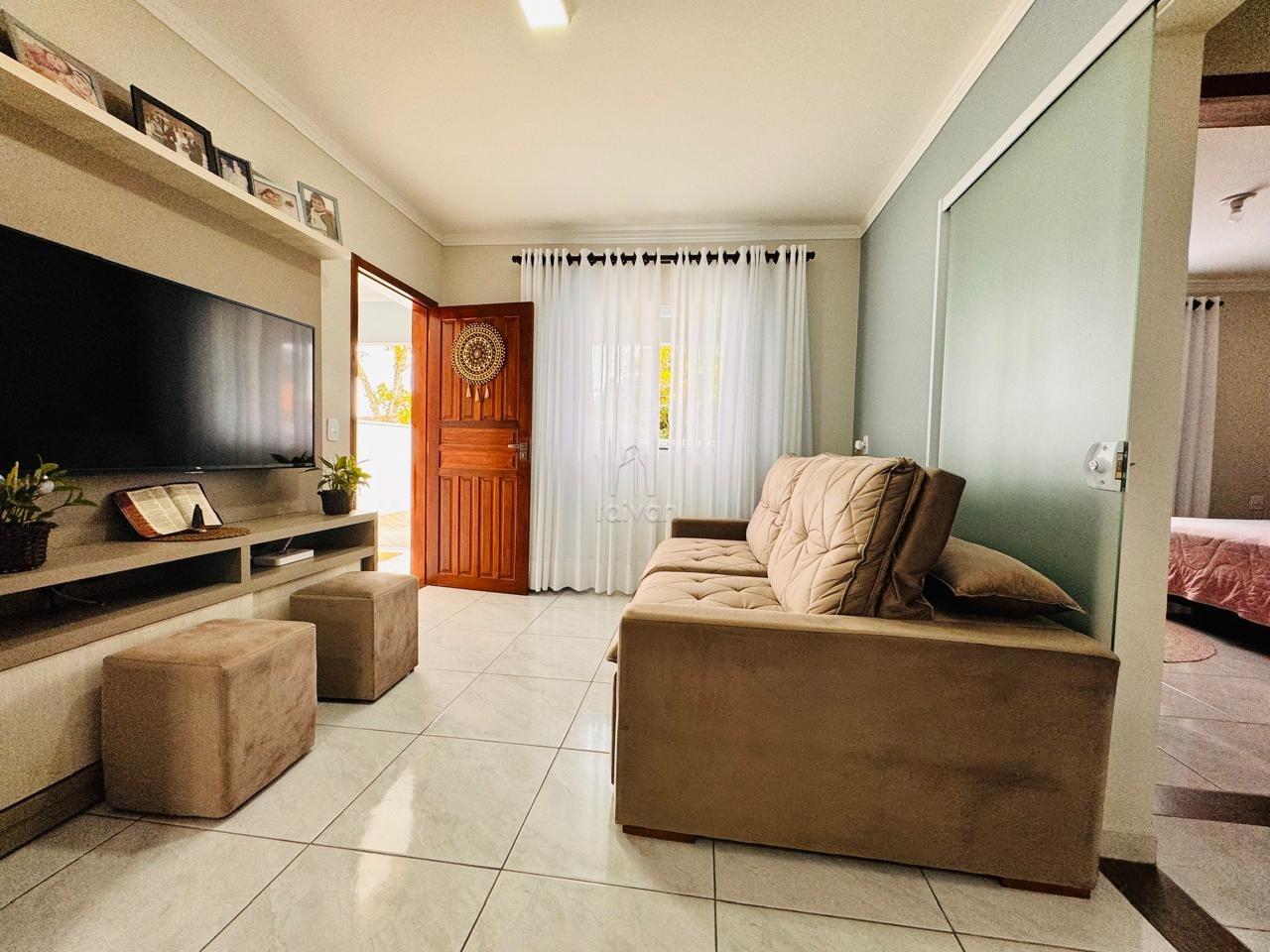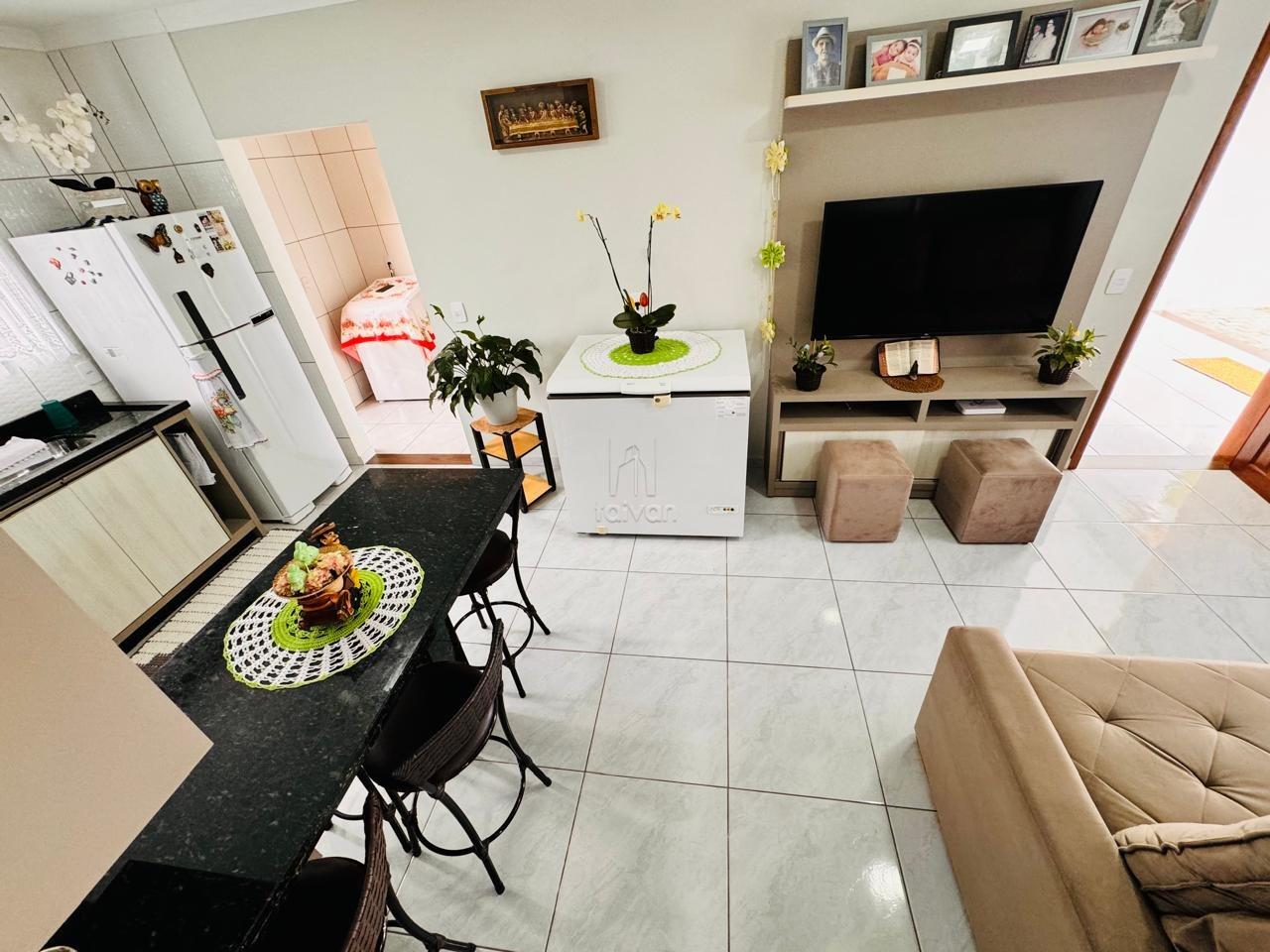 Conta com sala de estar e cozinha integradas, 2 quartos, 1 banheiro, área de serviço, área de festas com churrasqueira, quintal e 3 vagas.