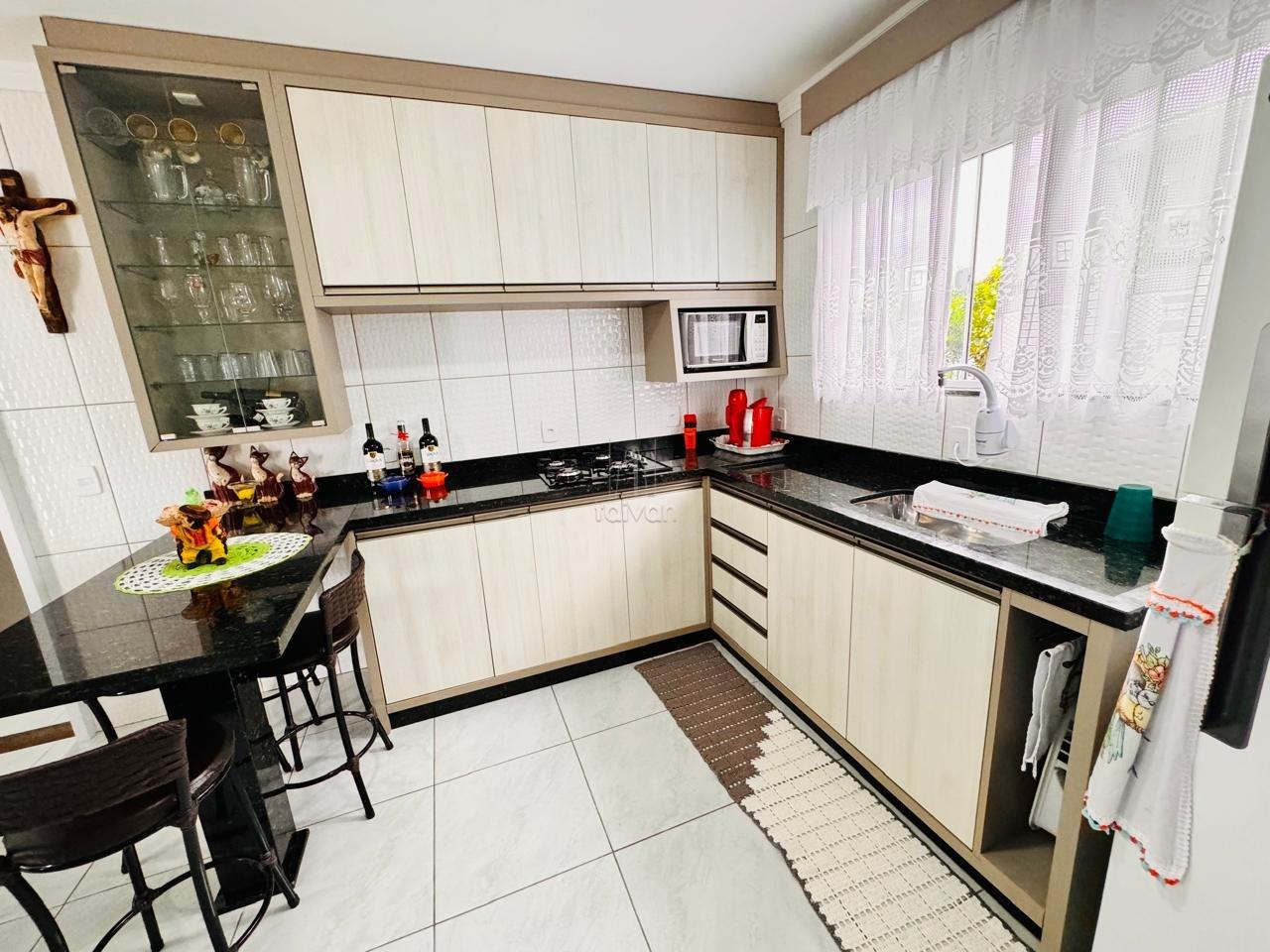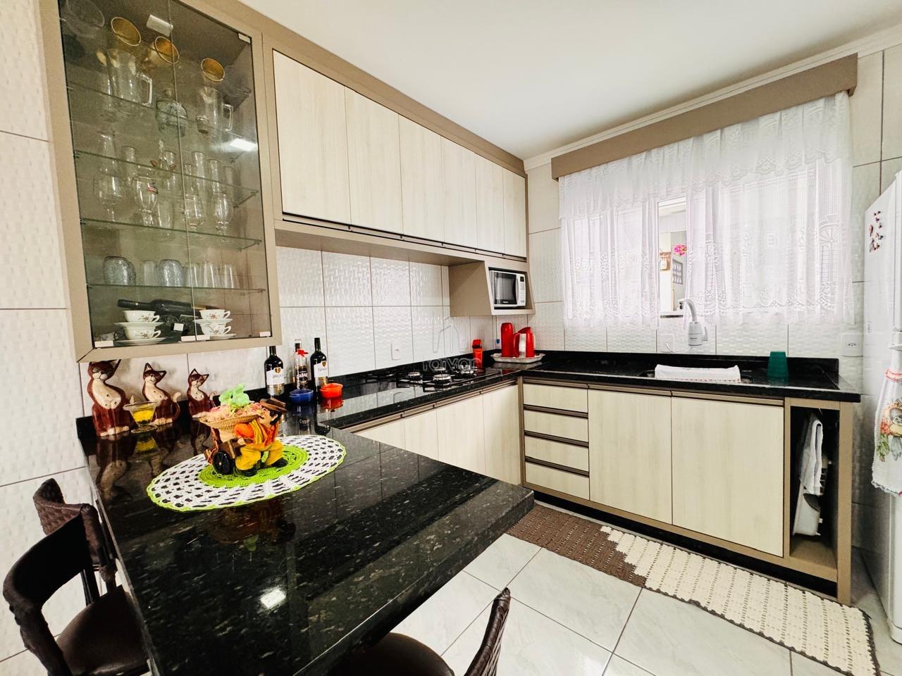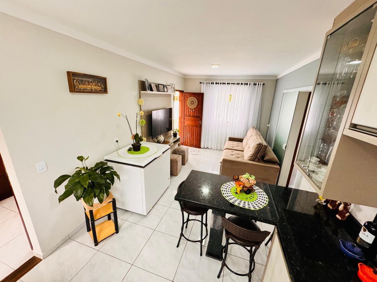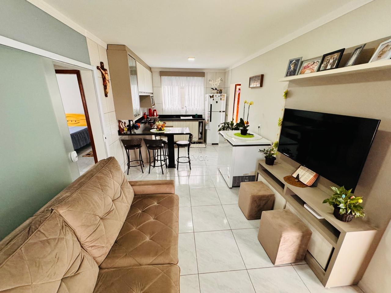 Conta com sala de estar e cozinha integradas, 2 quartos, 1 banheiro, área de serviço, área de festas com churrasqueira, quintal e 3 vagas.
