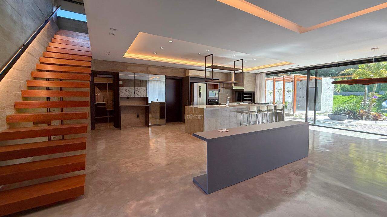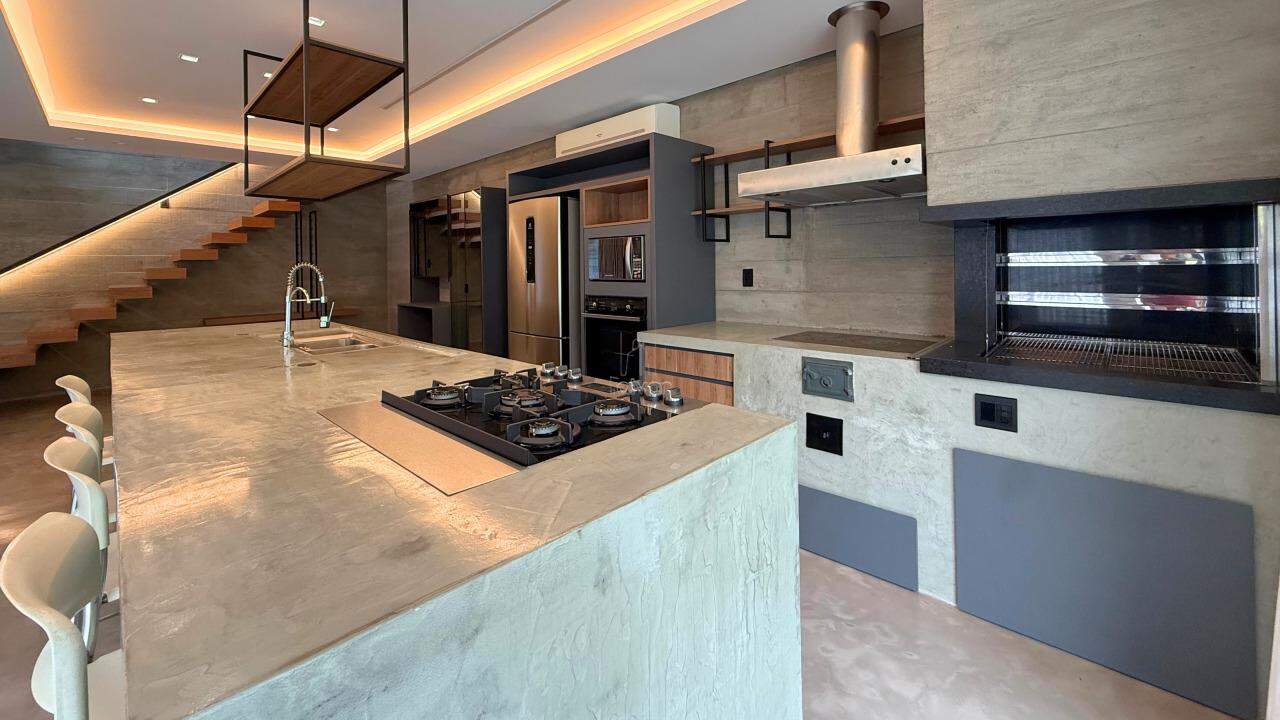O living unindo sala de estar, jantar e cozinha gourmet com churrasqueira é ideal para receber amigos e familiares. A área social se abre para uma vista deslumbrante do paisagismo e da piscina estilo prainha, que remete a um verdadeiro oásis de tranquilidade, complementada por um fire pit.