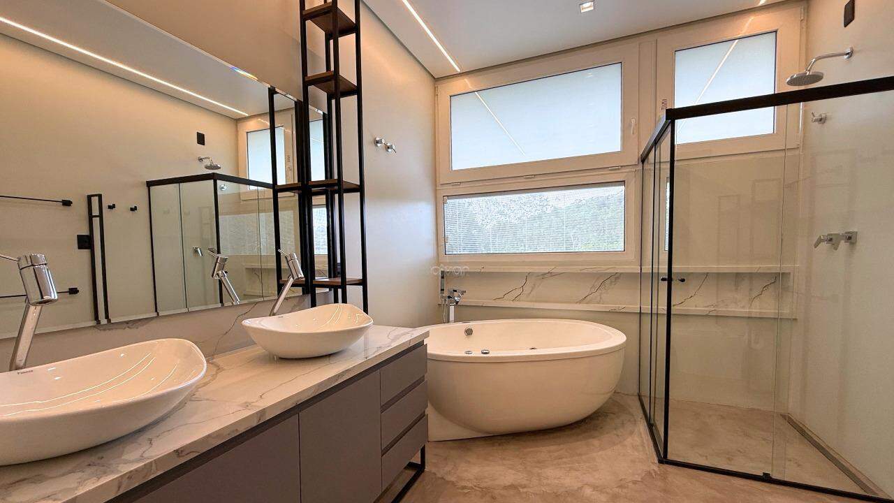 Dispõe de uma suíte master com closet e banheira de hidromassagem, uma suíte com closet e uma suíte adicional, todas com acesso à varanda e vistas privilegiadas para a natureza. Para maior conveniência, há 2 banheiros sociais e 1 lavabo, área de serviço e despensa.