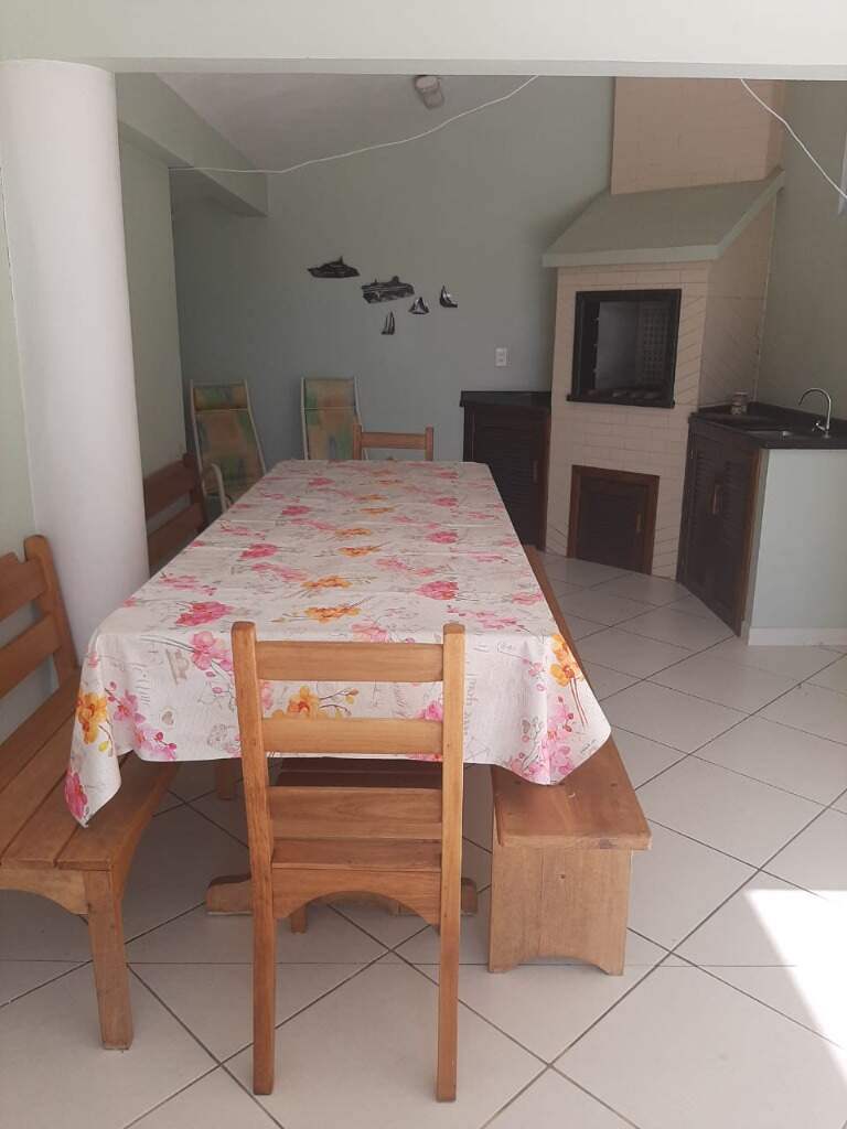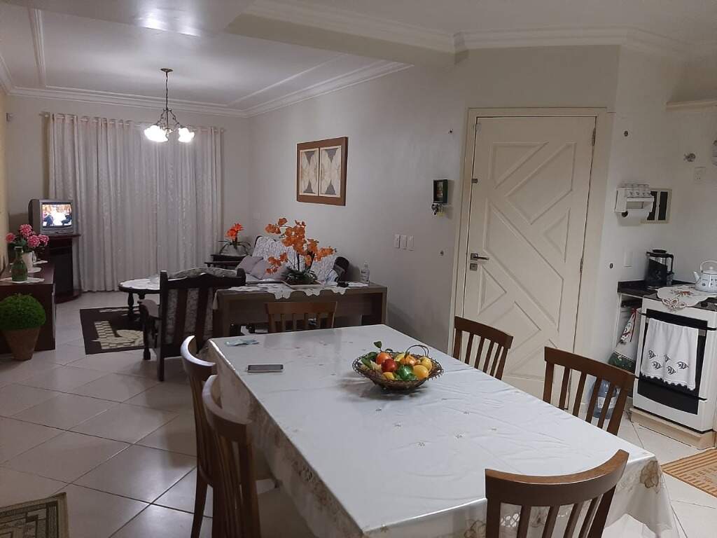 Sala de estar, jantar e cozinha integrados, área de festas com churrasqueira.