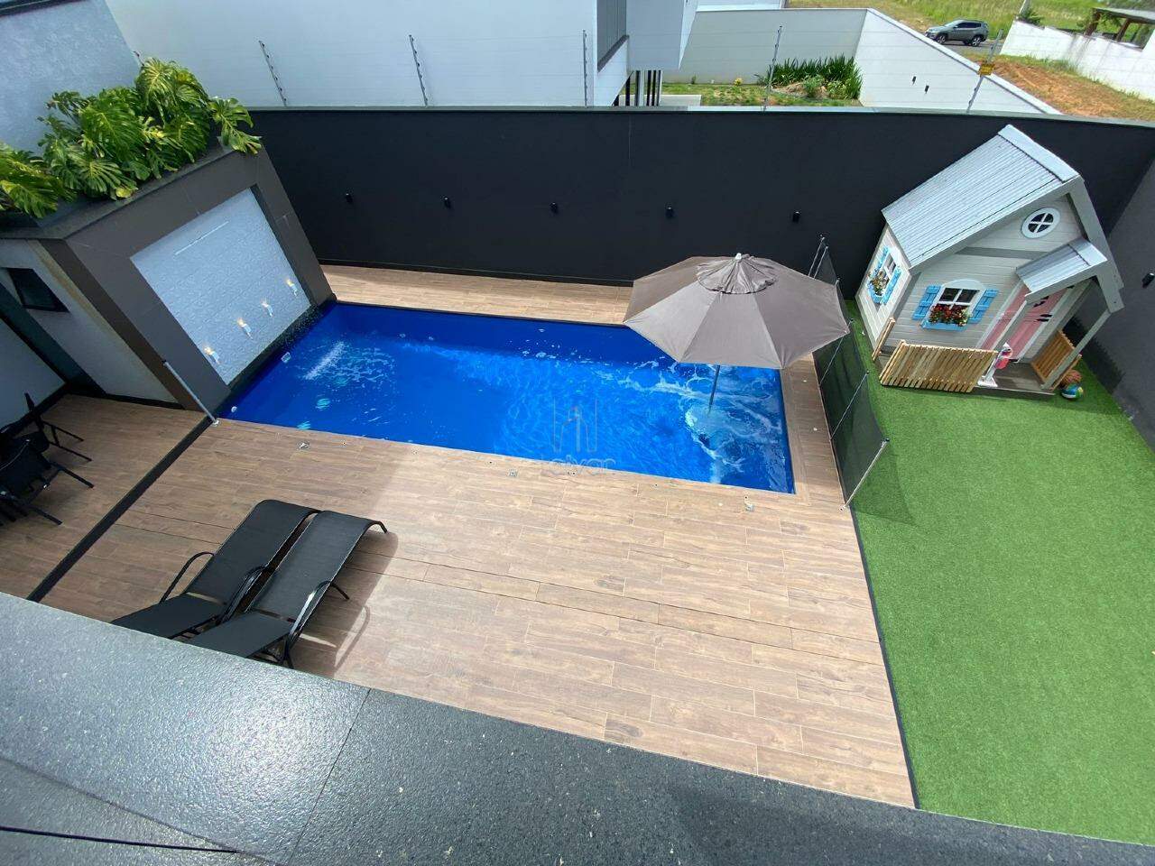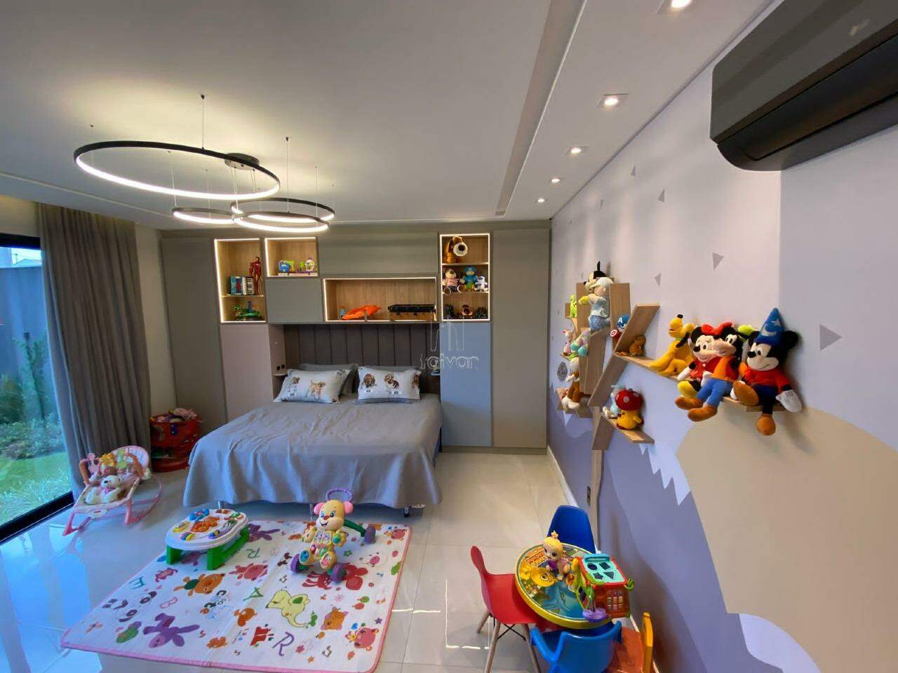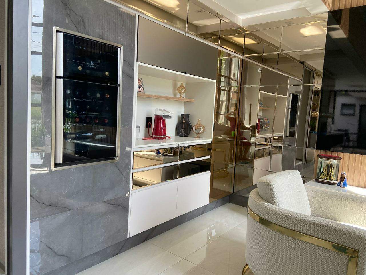 Piso inferior: living amplo com pé direito duplo, cozinha gourmet, com espaço para festas, podendo ser integrados ou totalmente individualizados. Ainda, possui brinquedoteca/quarto, podendo ser utilizada como suíte, banheiro social, área de serviço, garagem para dois carros. No espaço externo quintal com grama sintética, banheiro, piscina aquecida com bar molhado e uma linda cascata.