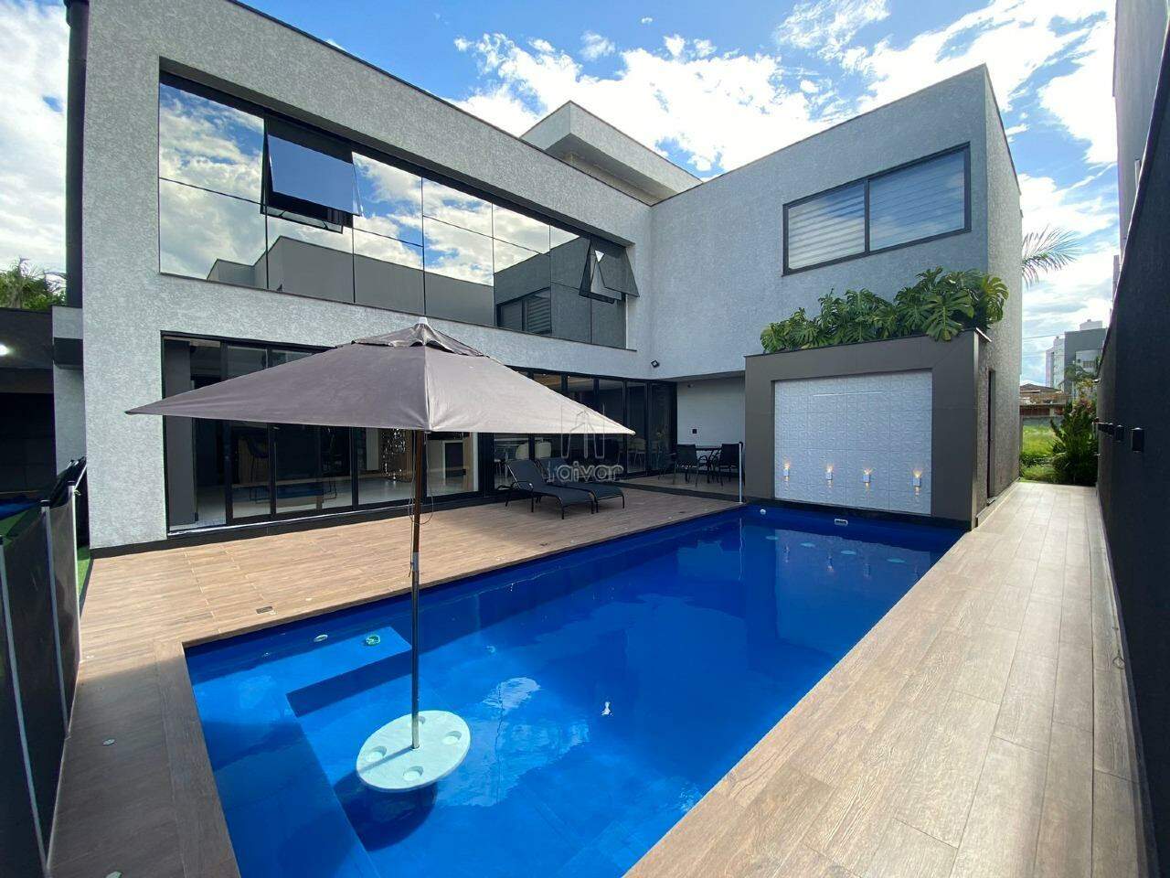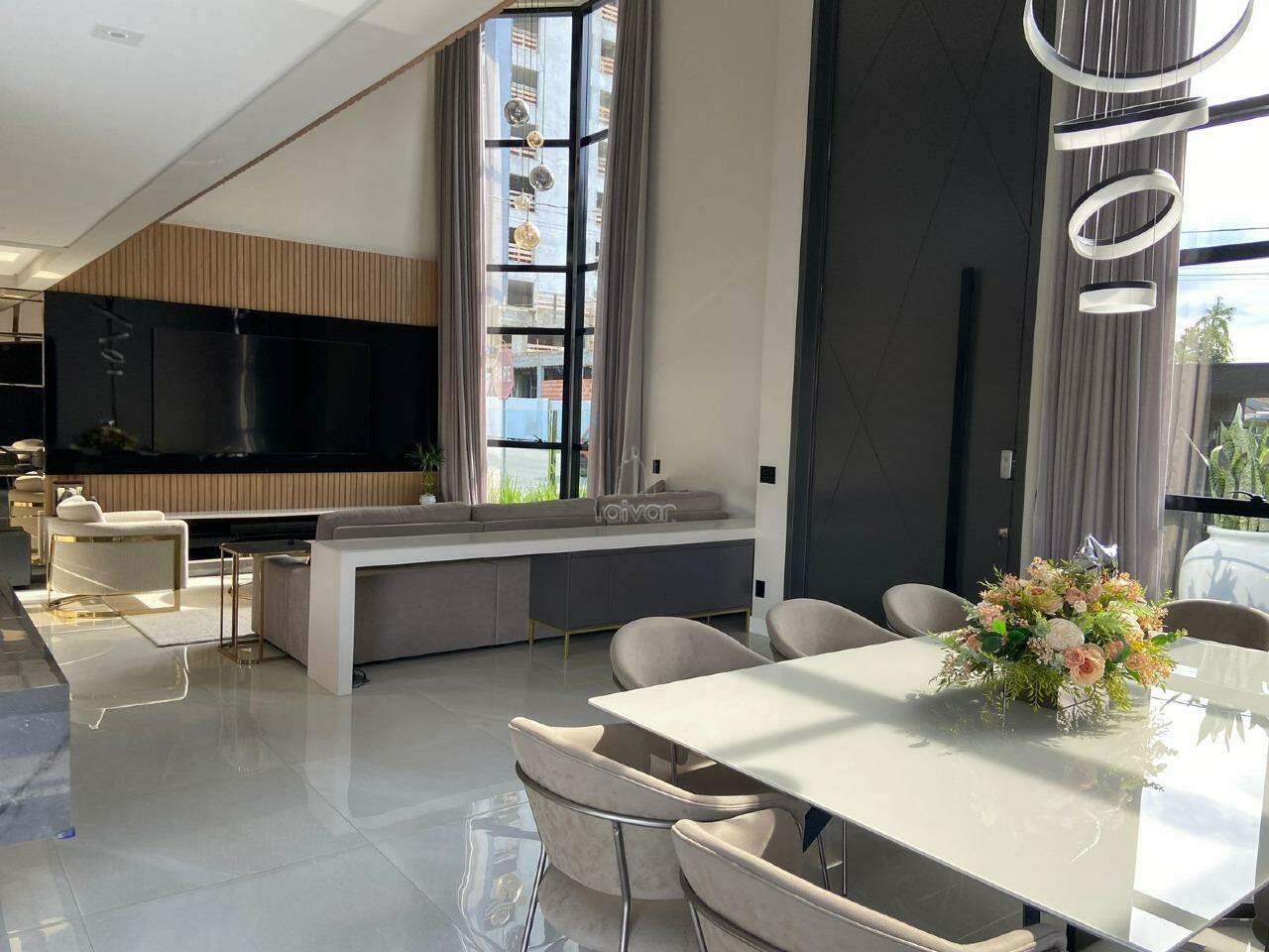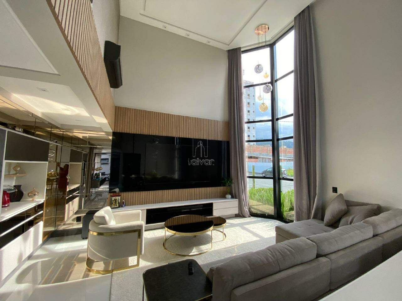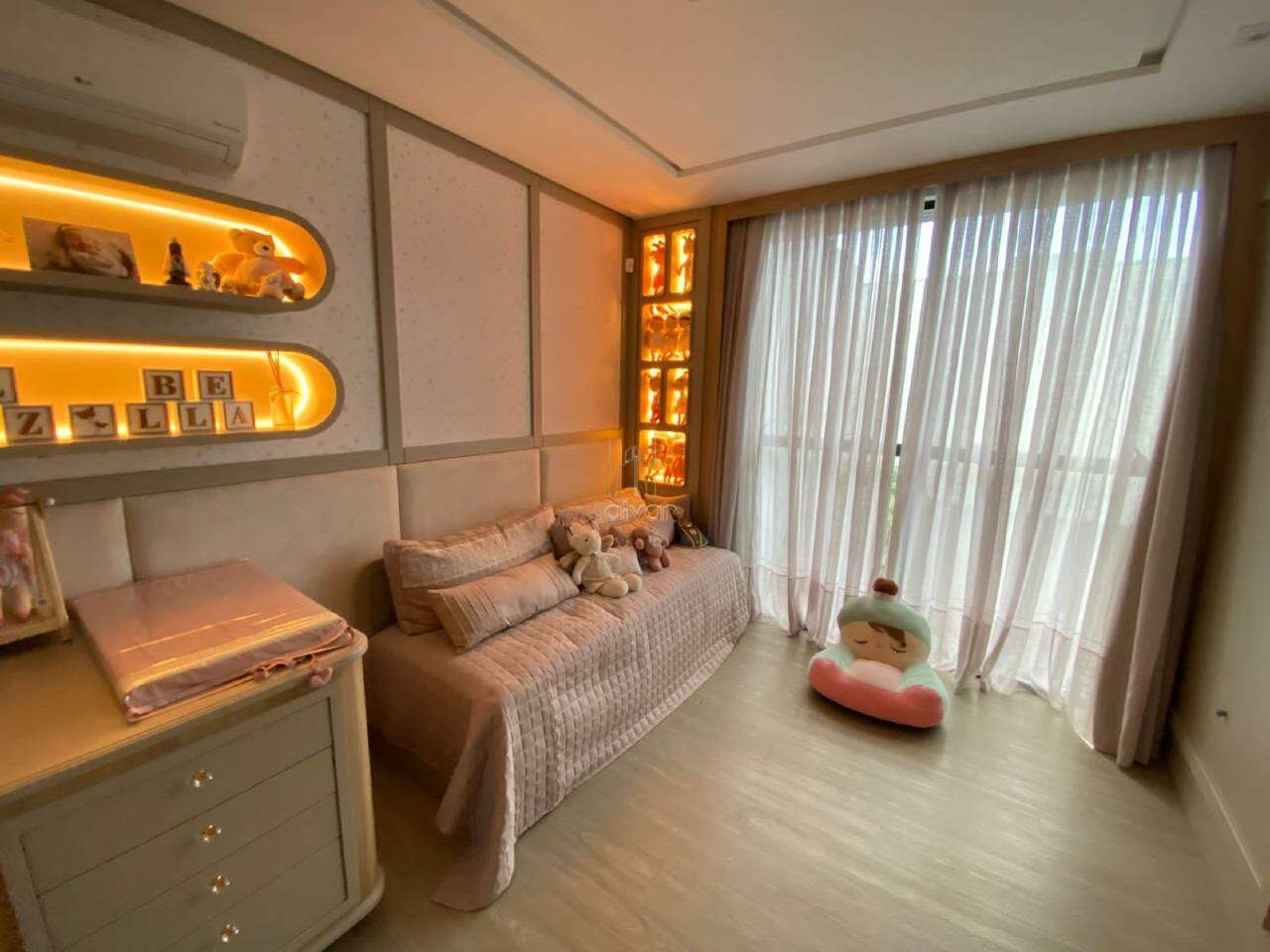Piso inferior: living amplo com pé direito duplo, cozinha gourmet, com espaço para festas, podendo ser integrados ou totalmente individualizados. Ainda, possui brinquedoteca/quarto, podendo ser utilizada como suíte, banheiro social, área de serviço, garagem para dois carros. No espaço externo quintal com grama sintética, banheiro, piscina aquecida com bar molhado e uma linda cascata.