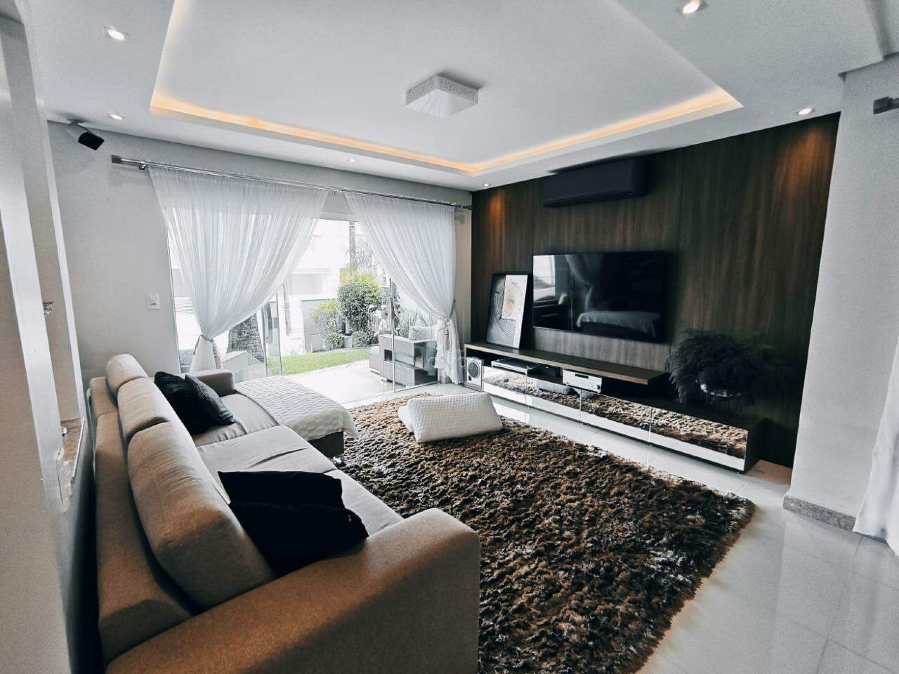 Parte térrea com sala de estar e jantar, sala de tv, cozinha, área de serviço, lavabo, área de festas com churrasqueira e 2 vagas de garagem.