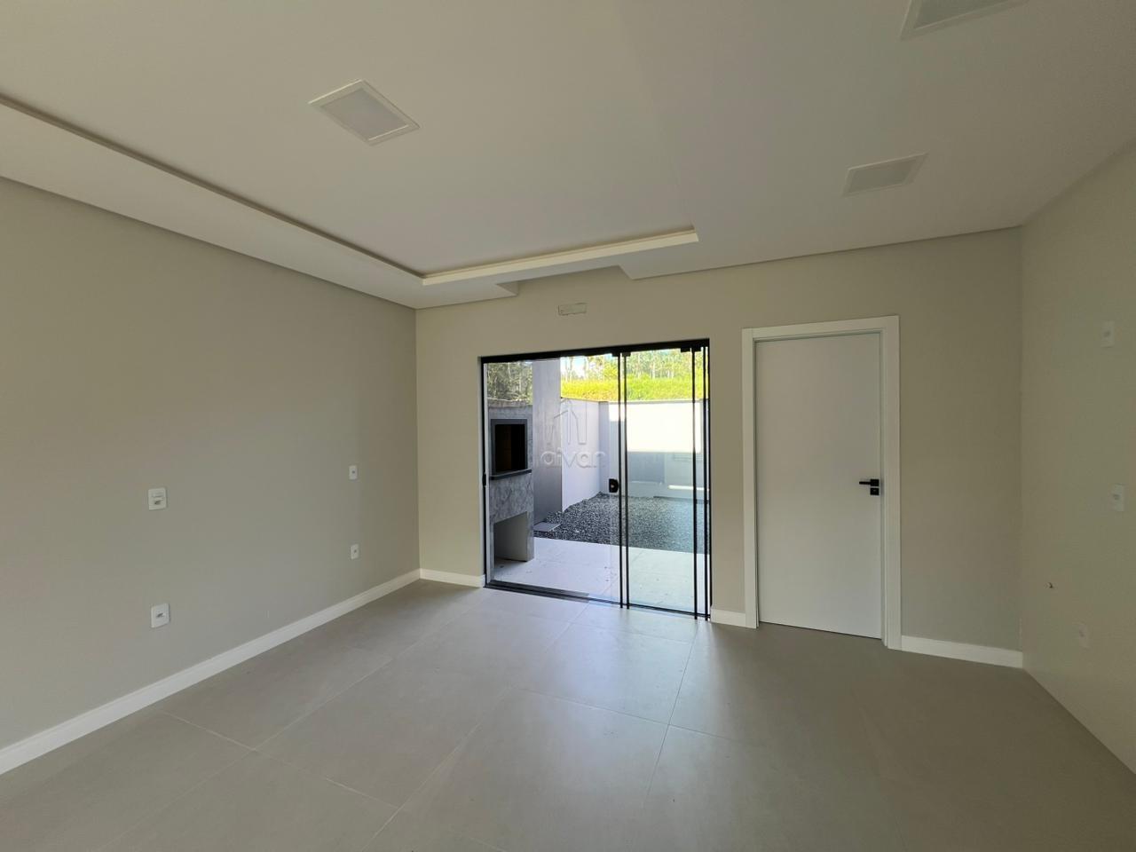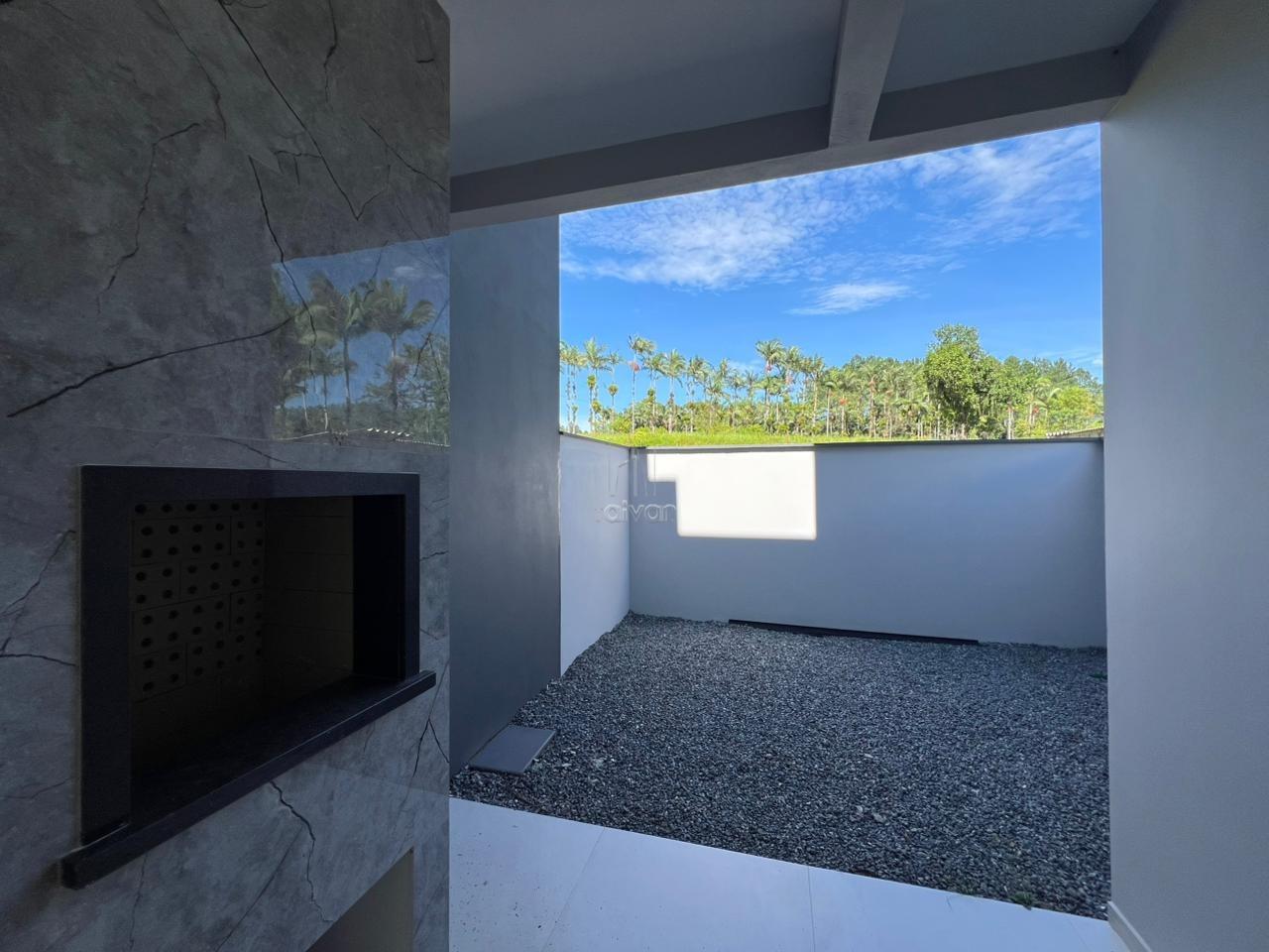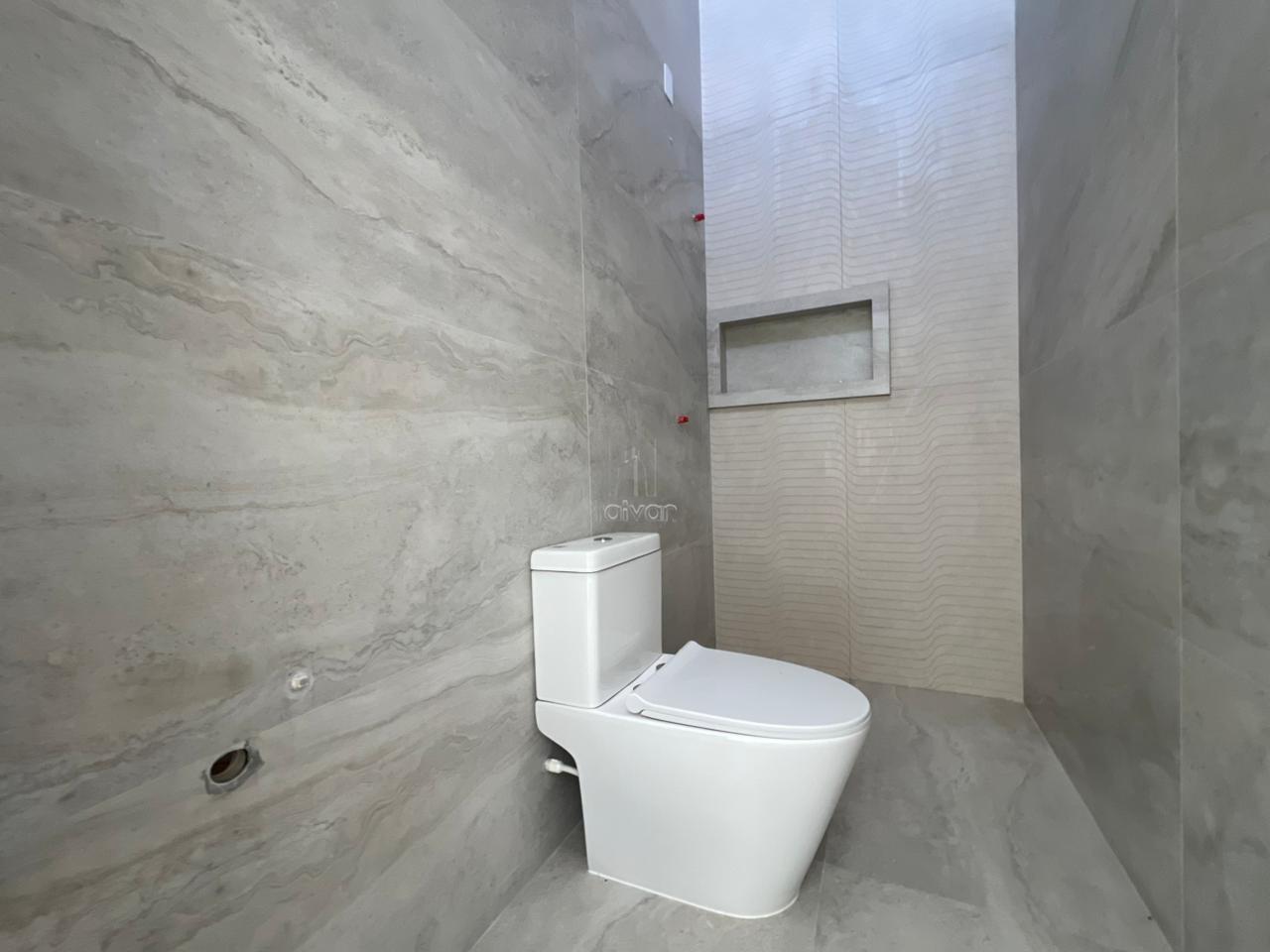 Oferece uma sala de estar, jantar e cozinha integradas, além de 1 suíte + 2 quartos. Possui também 1 banheiro social, 1 lavabo, área de serviço, churrasqueira, quintal e 2 vagas.
