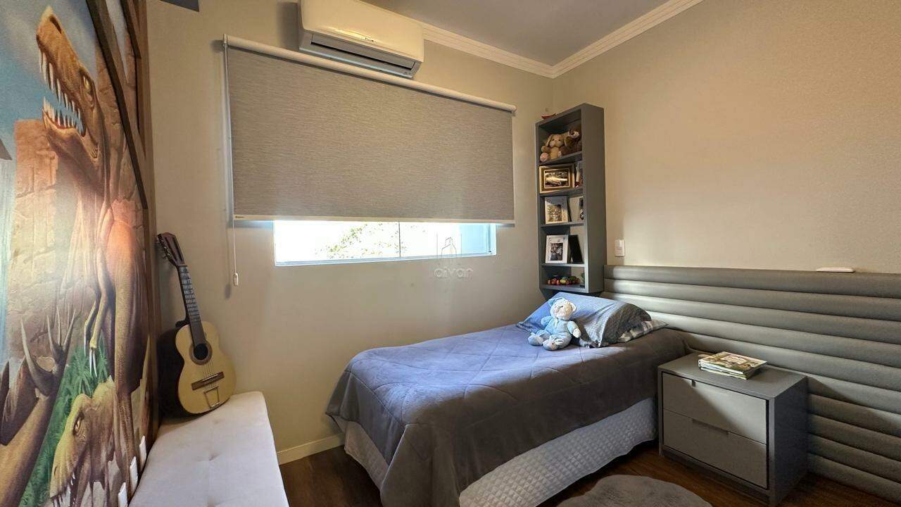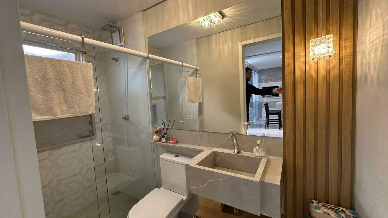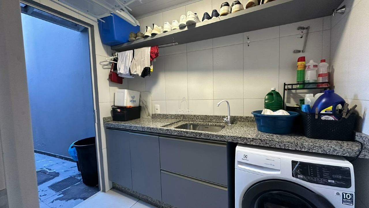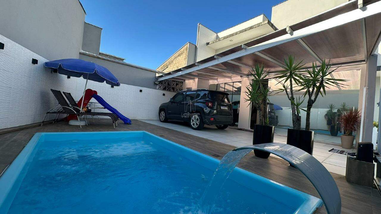 Possui ambientes integrados de sala de estar, jantar, cozinha e churrasqueira, além de 1 suíte + 2 quartos, 1 banheiro social, 1 lavabo, área de serviço e espaço para festas. O imóvel conta ainda com piscina, quintal e duas vagas de garagem.